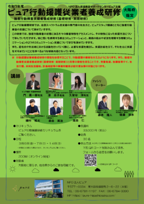NPO法人ピュアでは、強度行動障害の支援について深めていく「ピュア行動援護従業者養成研修」を今年の3月にも開催いたします!